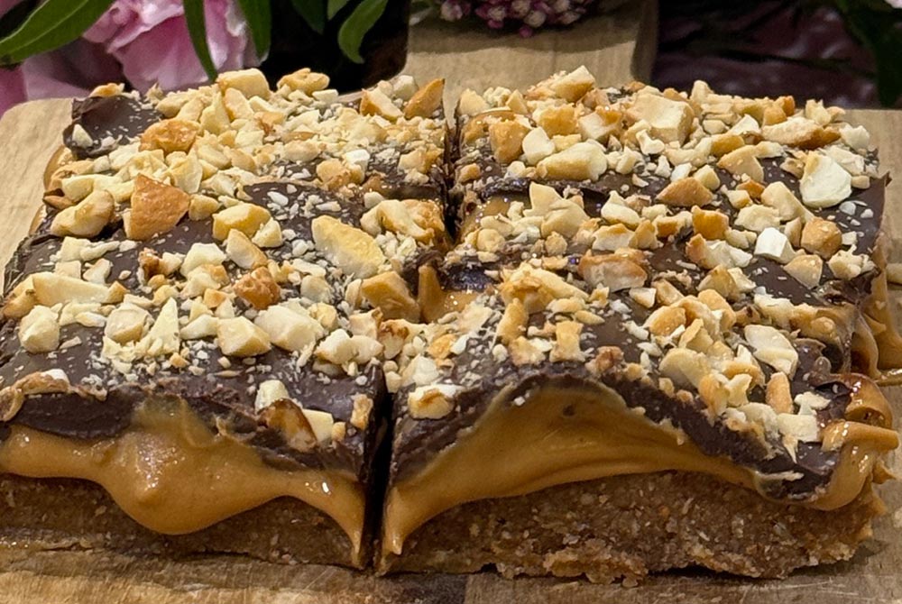 Izblendirajte 150g badema sa 150g urmi koje su kratko bile potopljene u vodi. Možete po želji dodati i 2 kašike suvog grožđa. U kalup stavite papir za pečenje i ravnomerno rasporedite izblendiranu masu. Premažite je kikiriki puterom (oko 60g), zatim otopljenom crnom čokoladom (100g) i na zatim pospite sa 2 kašike iseckanih indijskih oraha. Zamrznuti na 30 minuta i iseći na kocke.