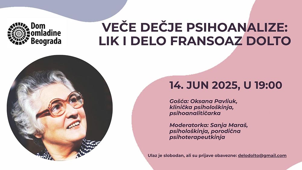 Razgovor o detetu kao subjektu u kome, od samog rođenja, odzvanja želja — čija priča počinje još pre reči. Razgovor o poznatoj francuskoj dečjoj psihoanalitičarki, Fransoaz Dolto, koja je postavila temelje nove etike u odnosu prema detetu održaće se 14. juna u Domu omladine Beograda u okviru tribine Veče dečje psihoanalize: Lik i delo Fransoaz Dolto